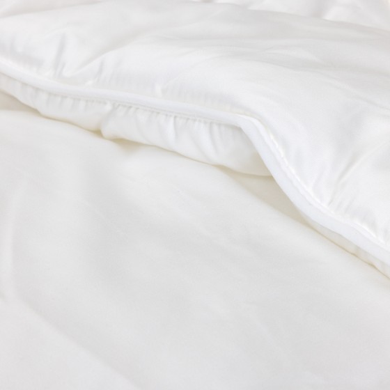 Couette chaude 350 g/m², composée d'une enveloppe en satin de coton pour un toucher très doux et de fines fibres polyester, procurant une sensation duvet.